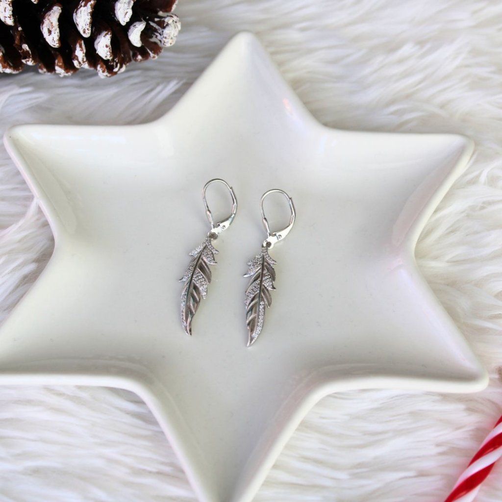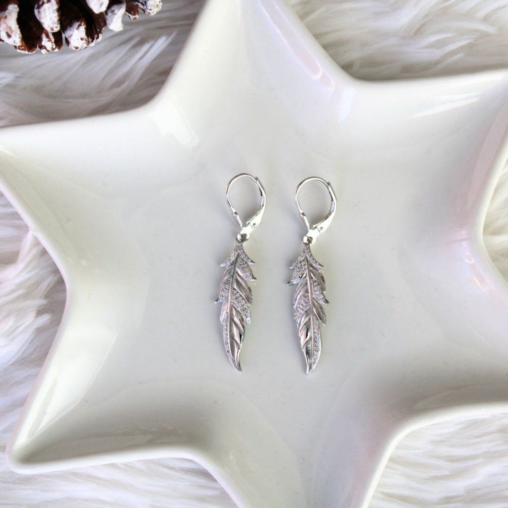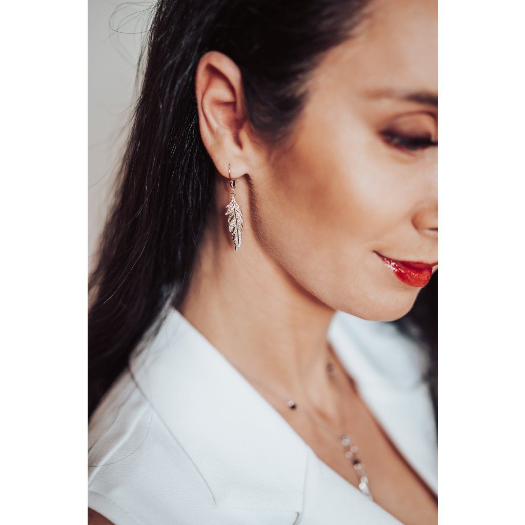 Stříbrné náušnice s bílými zirkony - pírko