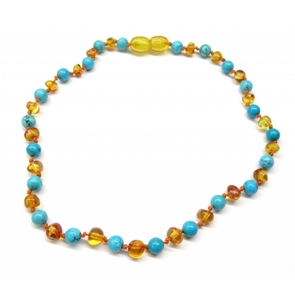 Jantarové korálky pro děti jsou vyrobeny z přírodního oblého ohlazeného jantaru s tyrkysem (lisovaný do pravidelných kamínků)- jsou leštěné, mají bezpečný šroubovací pojistný uzávěr vhodný pro alergiky (z polyresinu, tedy bez obsahu niklu) a pro případ přetržení je každý korálek je zajištěn zvlášť uzlíkem.