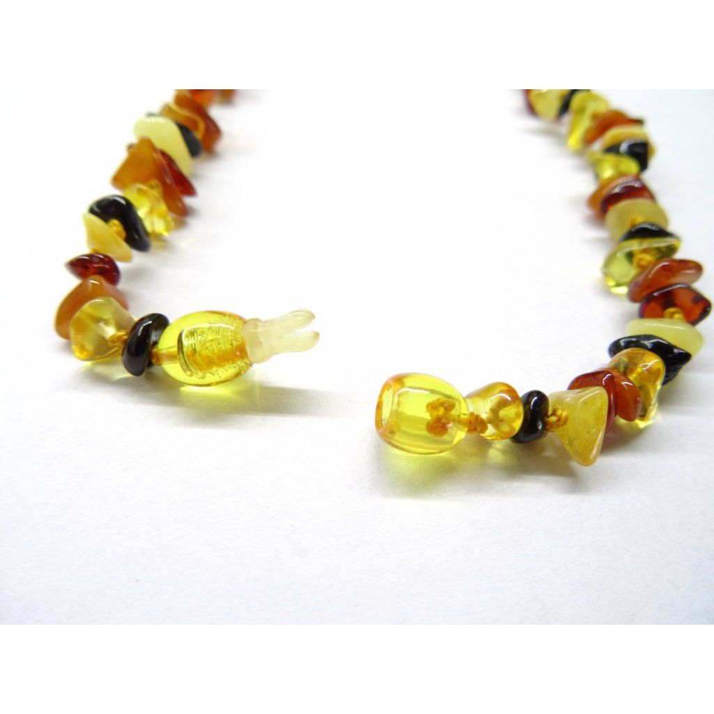 Jantarové korálky pro děti jsou vyrobeny z přírodního jantaru ohlazeného do tvaru nugetek a jsou vyleštěné. Mají bezpečný šroubovací pojistný uzávěr vhodný pro alergiky (tedy bez obsahu niklu). Každý korálek je zajištěn zvlášť uzlíkem, aby se v případě přetržení nevysypaly všechny. Délka náhrdelníku je přibližně 31 - 32,5 cm.