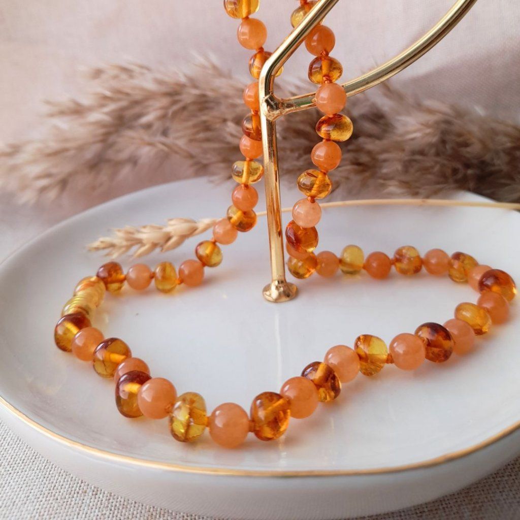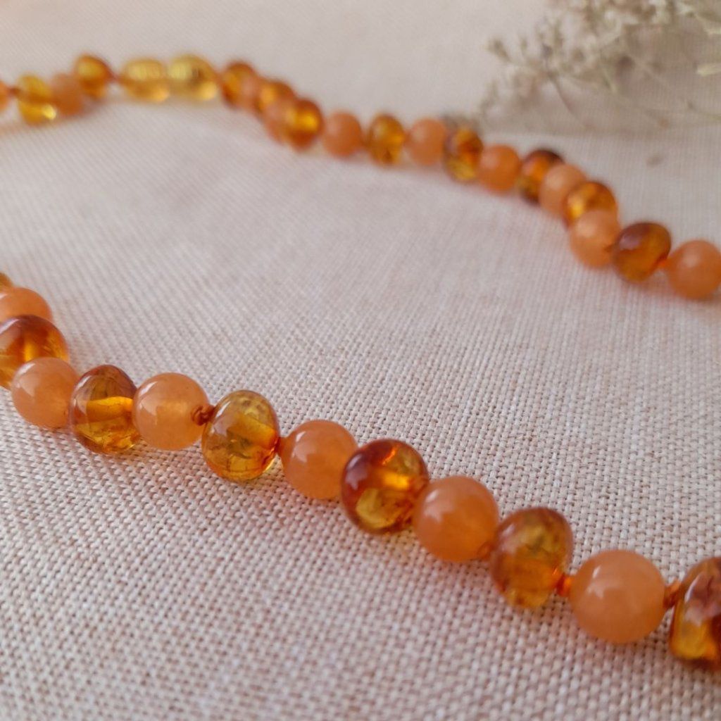 Medové jantarové korálky pro děti - jantar a broskvový avanturín