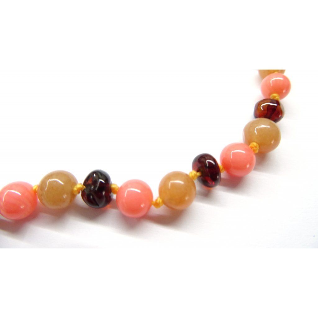 Jantarové korálky pro děti jsou vyrobeny z přírodního oblého ohlazeného jantaru a dále korálu a broskvového avanturínu (lisované do tvaru pravidelných kamínků) - jsou leštěné, mají bezpečný šroubovací pojistný uzávěr vhodný pro alergiky (tedy bez obsahu niklu) a každý korálek je zajištěn pro případ přetržení zvlášť uzlíkem.