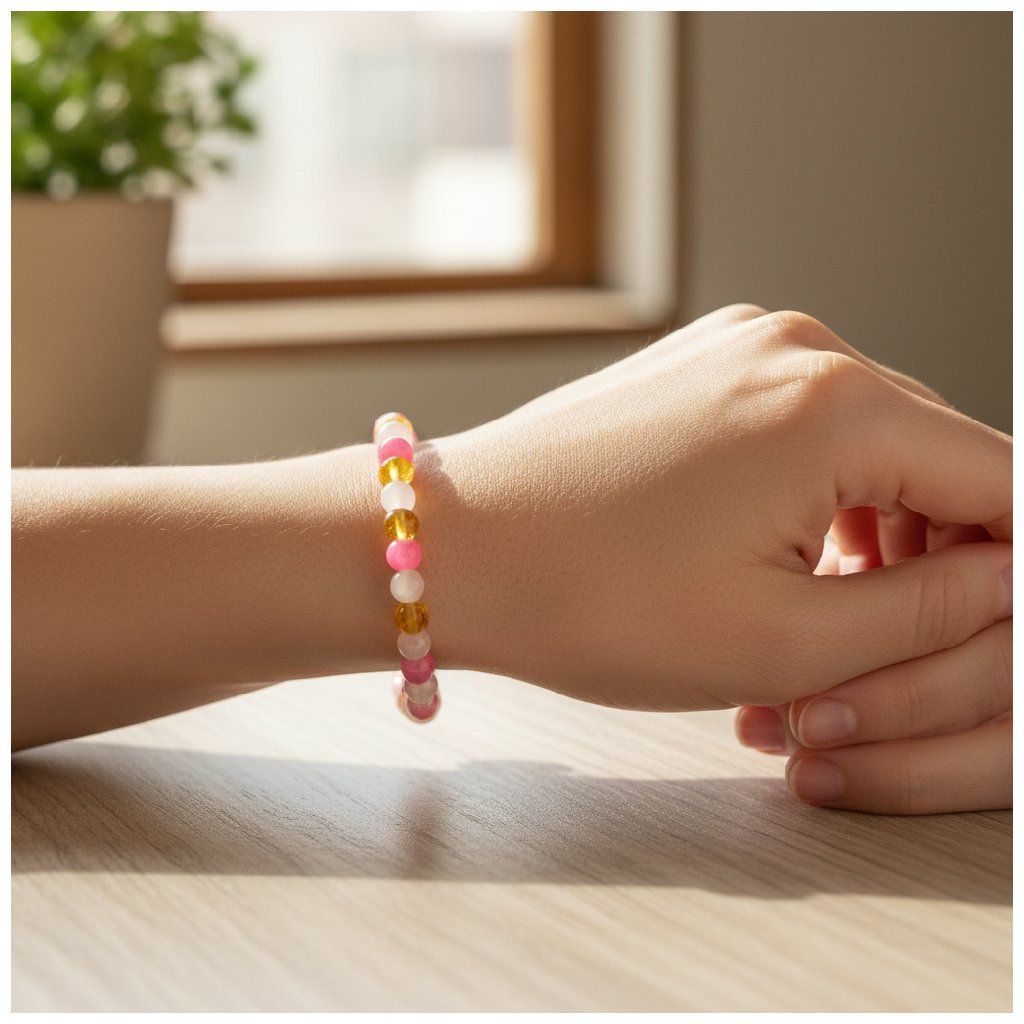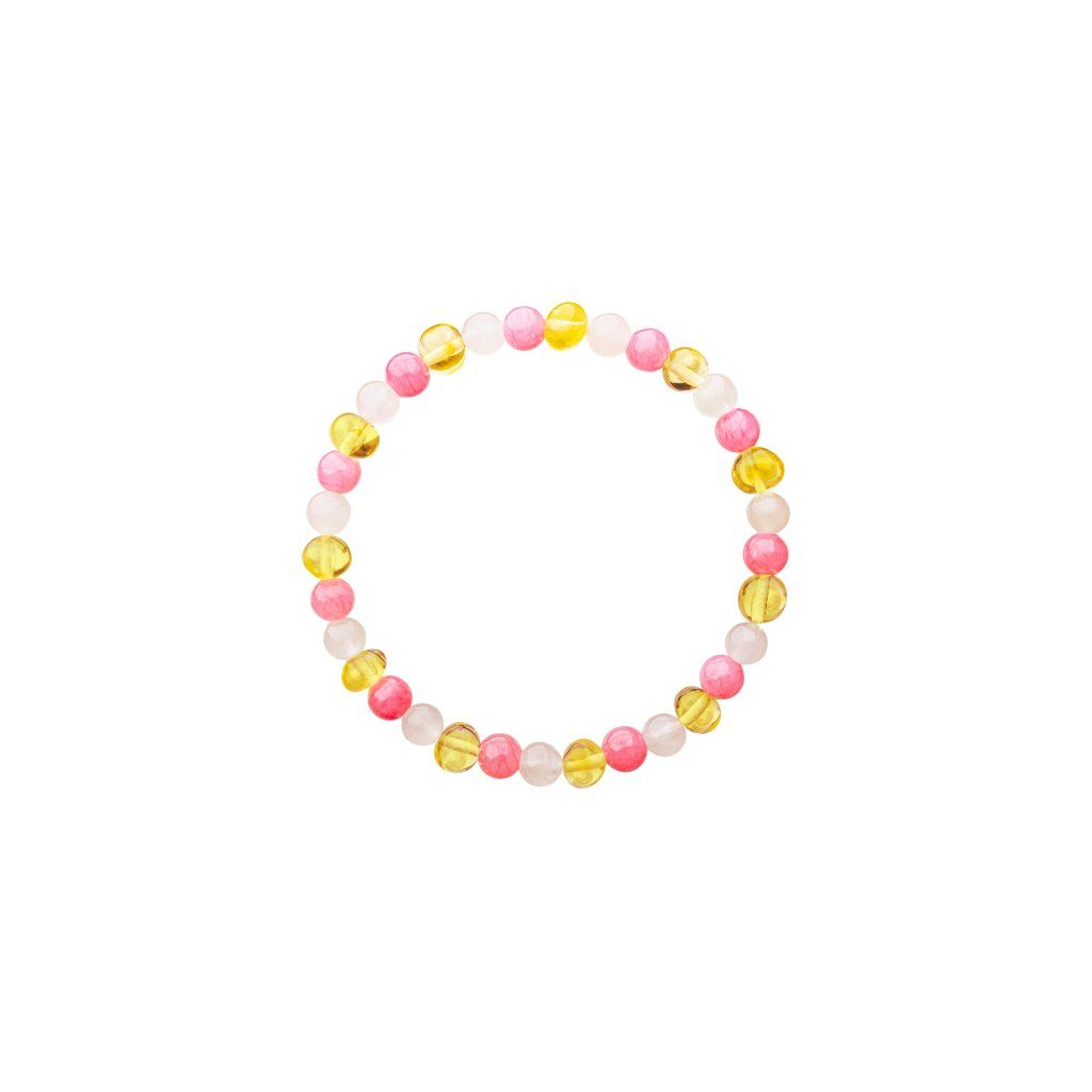 Ruční výroba z pravých kamenů – jantar, růženín a jadeit. Náramek na pružné gumičce, délka 19 cm. Jemná kombinace podporující radost, lásku a harmonii.