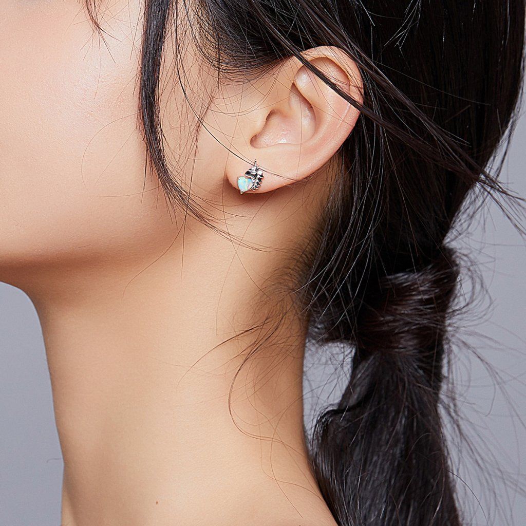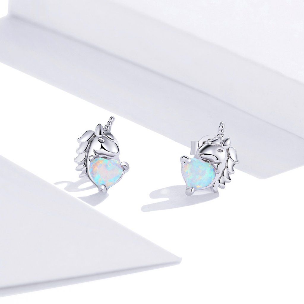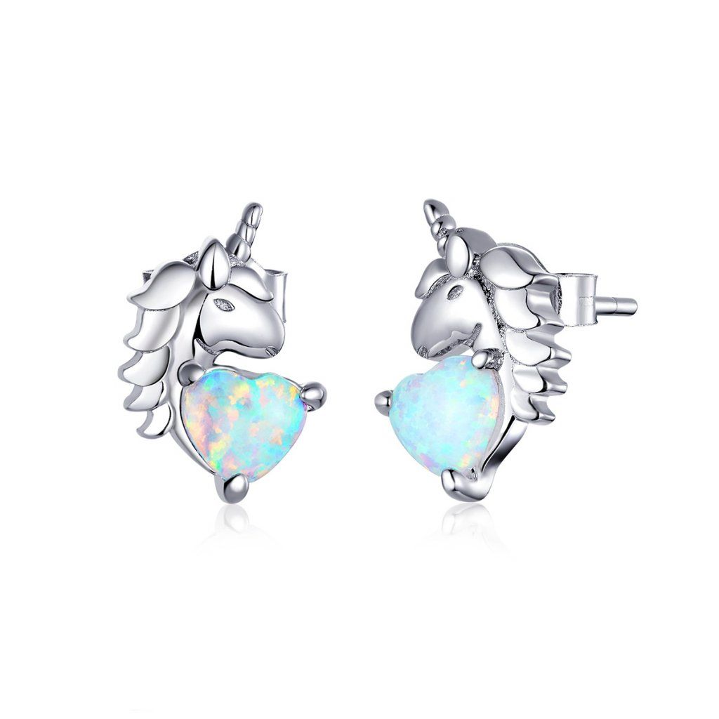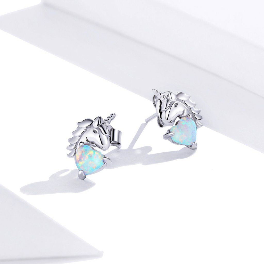 Stříbrné náušnice jednorožec se srdcem z opálu