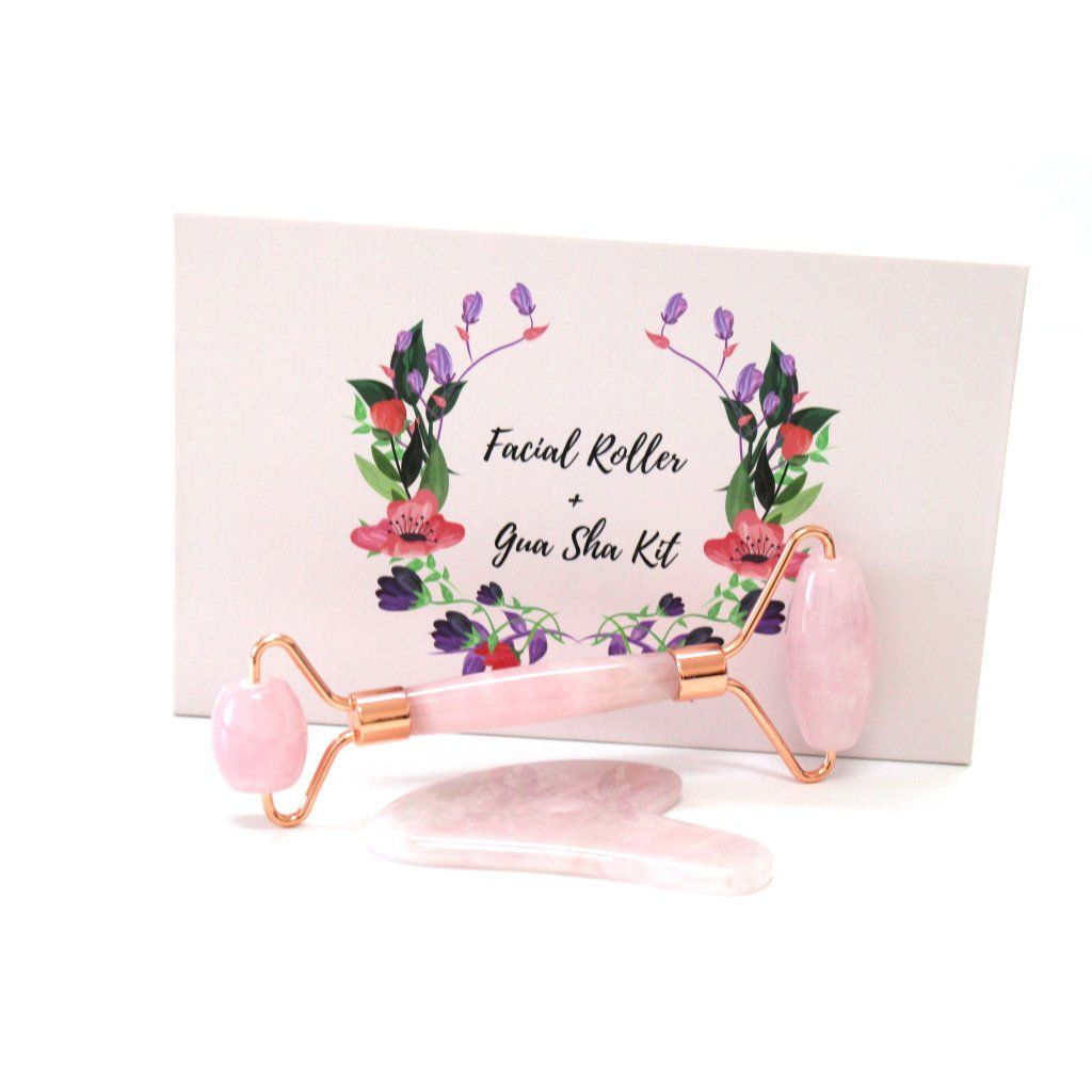 Dárková masážní sada face roller a kámen gua sha růženín
