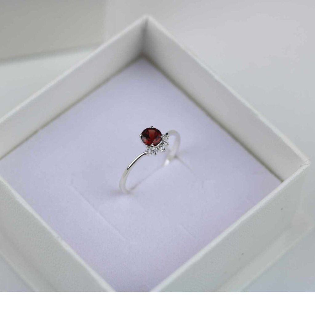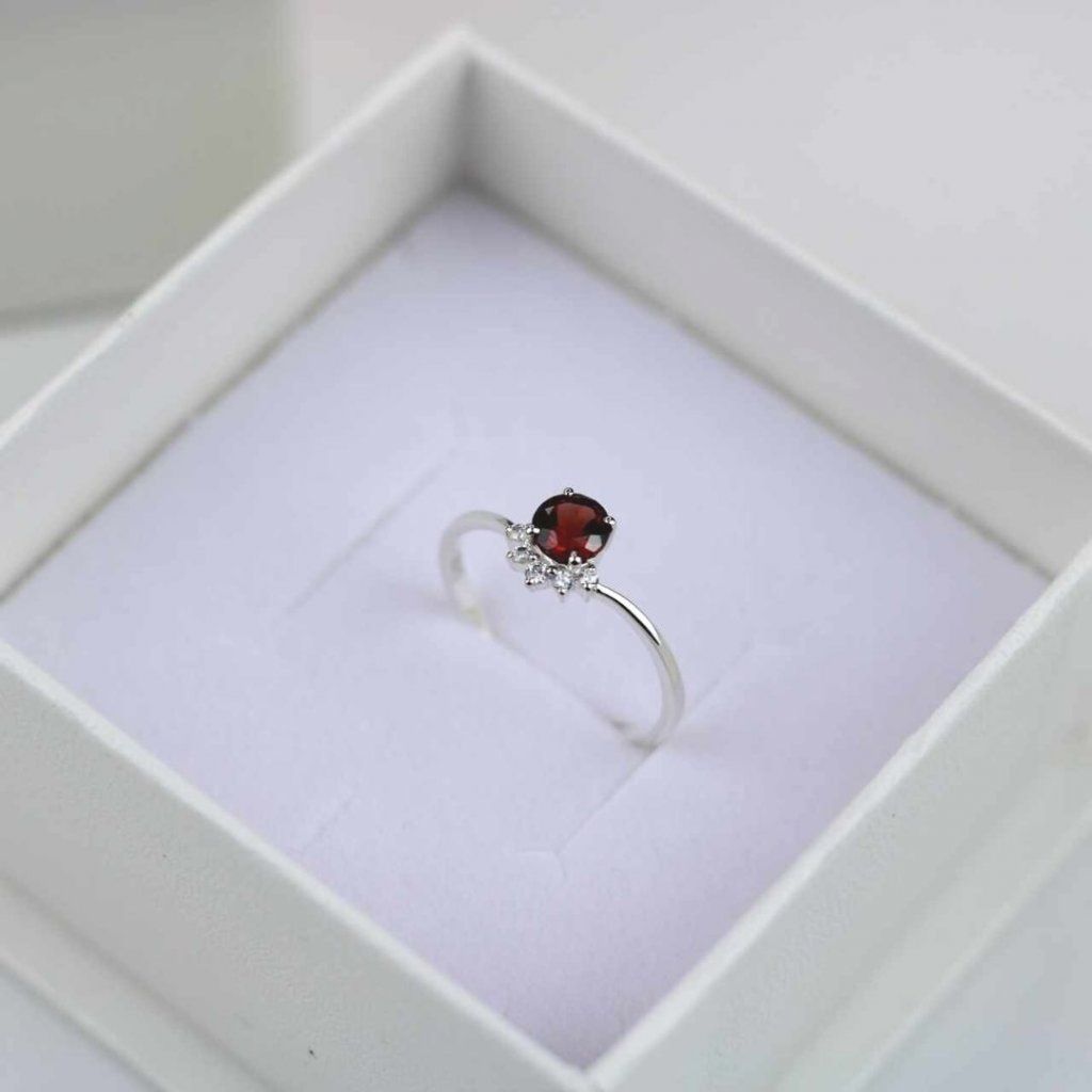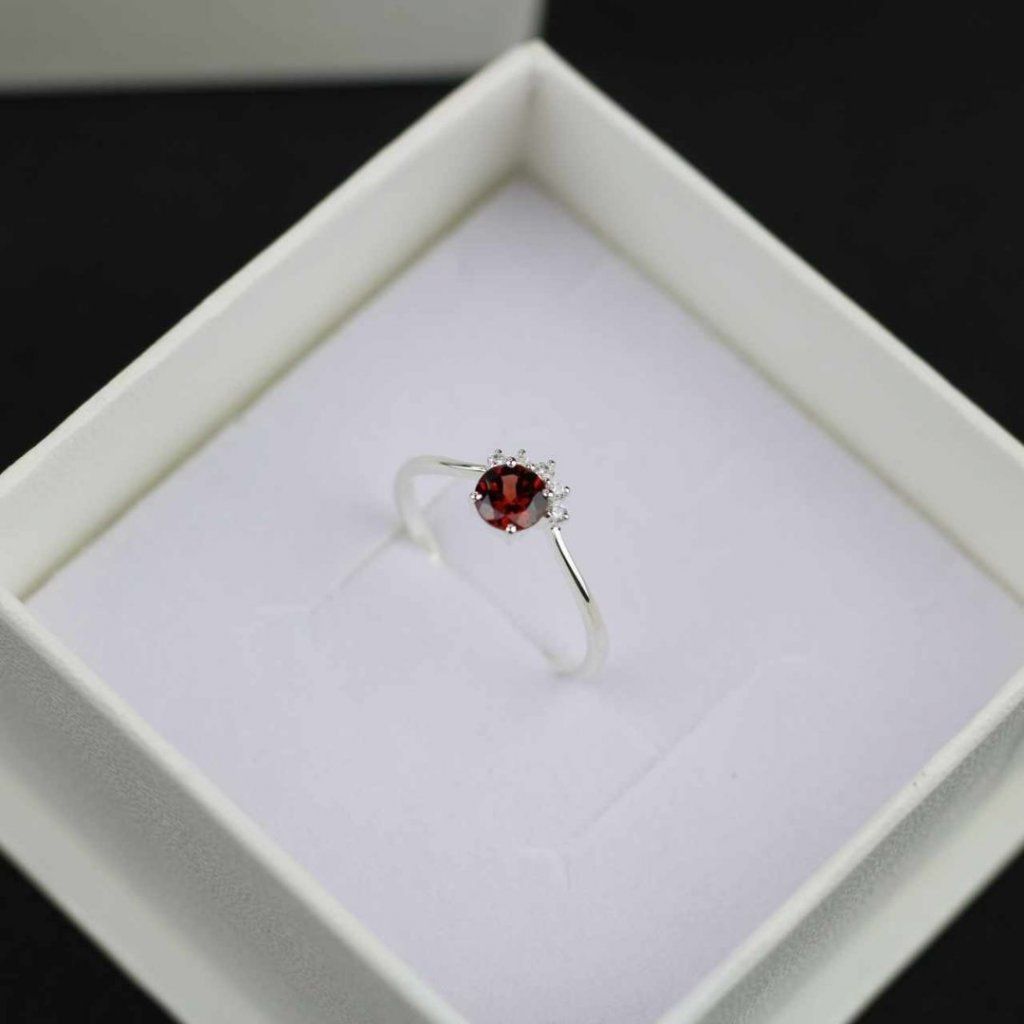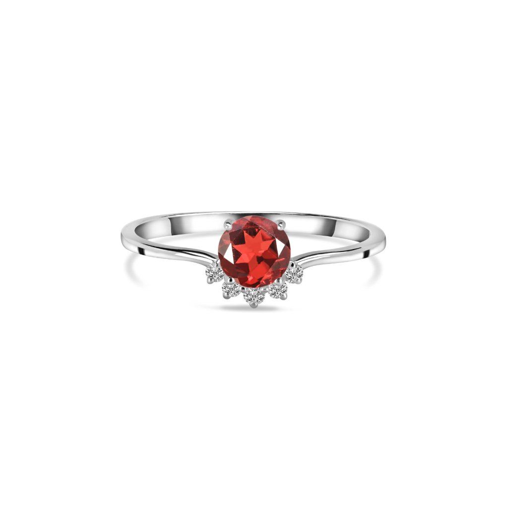 Rozměry kamenů: 5 x 5 mm (centrální granát) / 1.4 mm /1.6 mm /1.5 mm (bílé topazy).