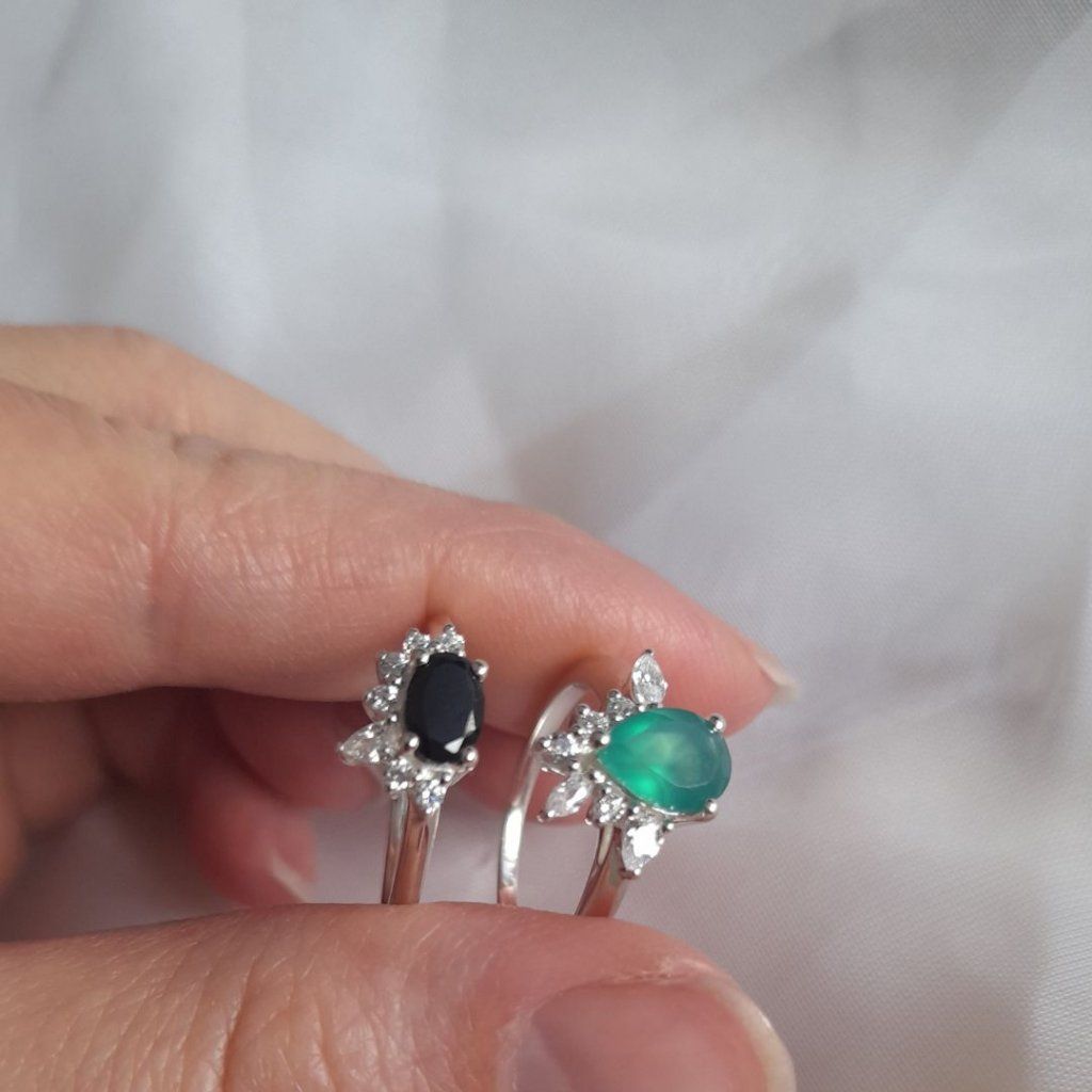 Materiál: rhodiované stříbro (Ag 925), kombinace s pravým zeleným onyxem a bílými topazy.
