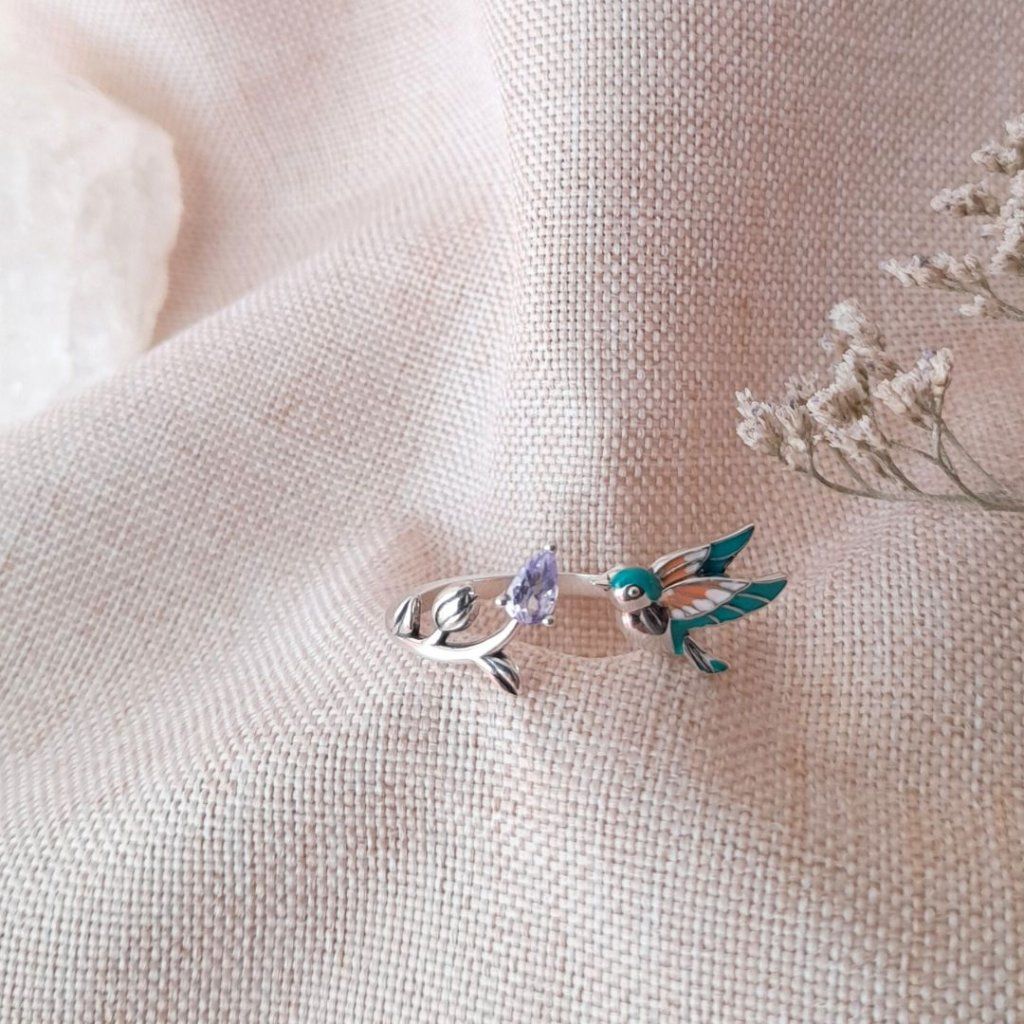 Stříbrný otevřený prsten Ptáček s květinou