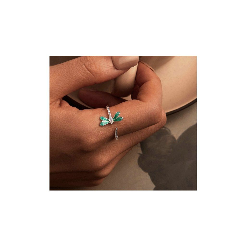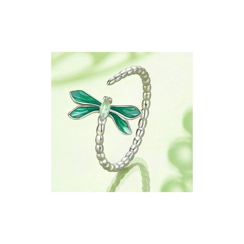 Stříbrný otevřený prsten vážka zelená
