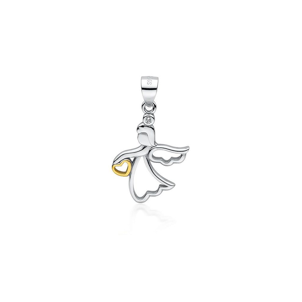 Stříbrný anděl se srdcem -pozlacené - se zirkonem